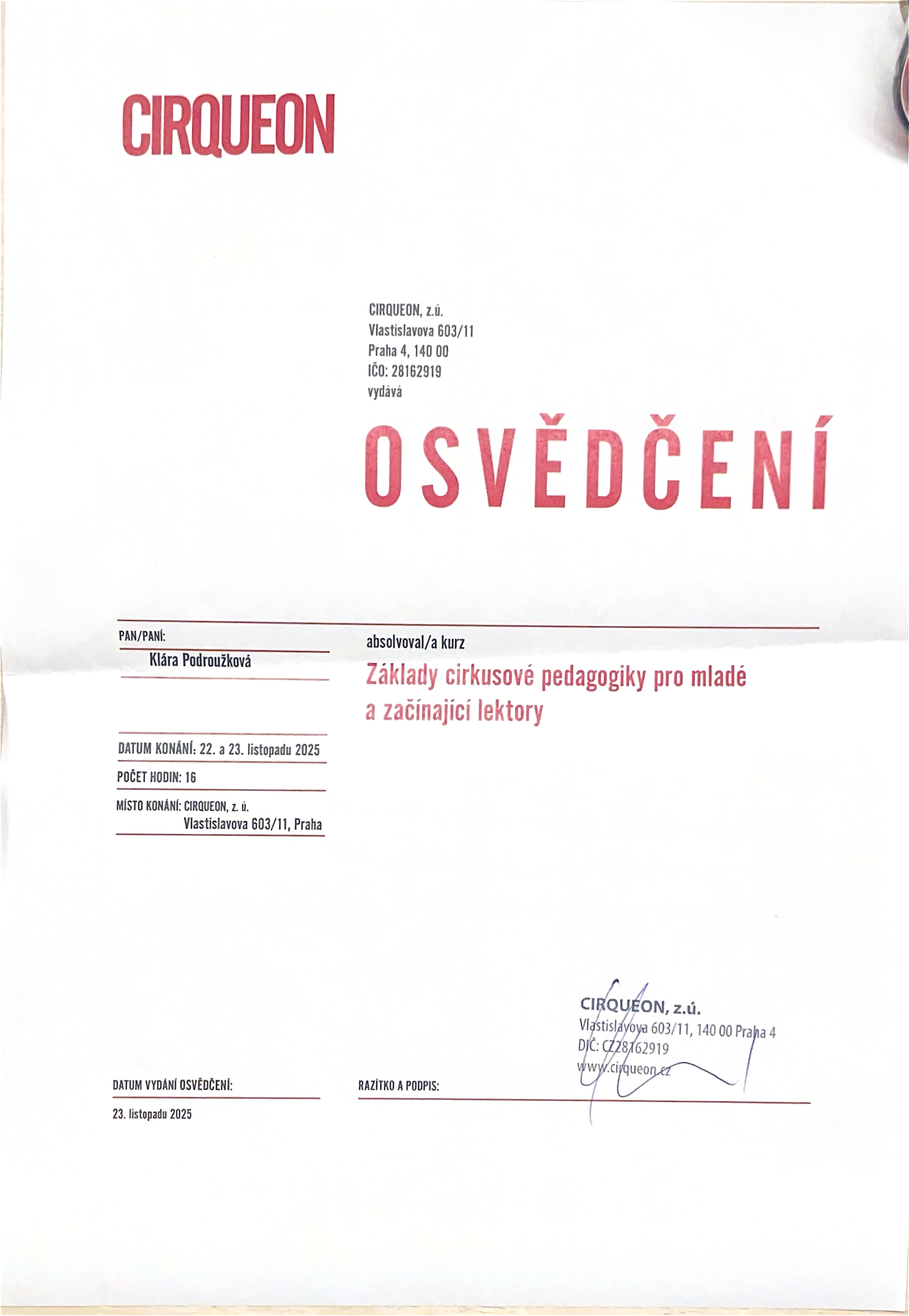 2025 - Cirqueon: Základy cirkusové pedagogiky pro začínající lektory 2026 - Cirqueon: Základy cirkusové pedagogiky